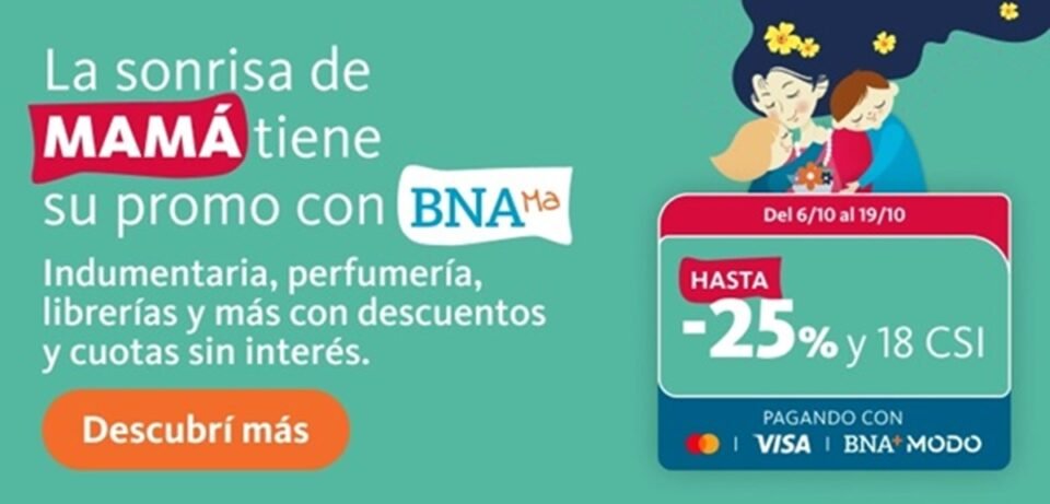 Bajo el lema “Este mes más que BNA+ … somos BNA Ma”, la entidad ofrecerá promociones con tarjetas de débito y crédito Visa y Mastercard, a través de la app “BNA+ MODO”, en rubros como indumentaria, perfumería, librerías y gastronomía, tanto en comercios adheridos como en los principales shoppings del país.