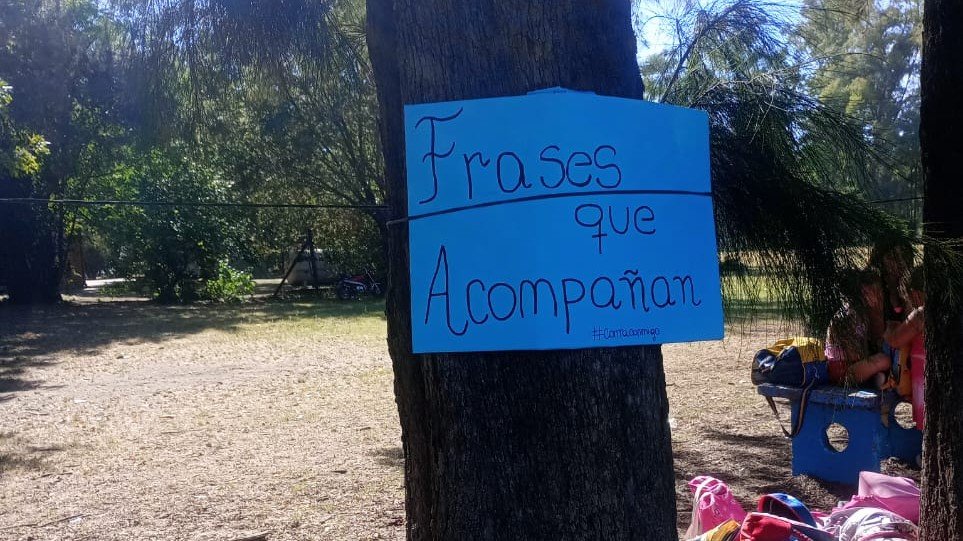La actividad central consistió en la creación de un Tendedero de Mensajes, una intervención comunitaria en el espacio público donde las y los participantes escribieron frases de acompañamiento y apoyo emocional en tarjetas que luego colgaron en sogas dispuestas entre árboles y estructuras del lugar. Mensajes como “acá estoy cuando lo necesites”, “gracias por confiar en mí” y “no estás solo/a” reflejaron la importancia de la escucha, la contención y el apoyo entre pares.