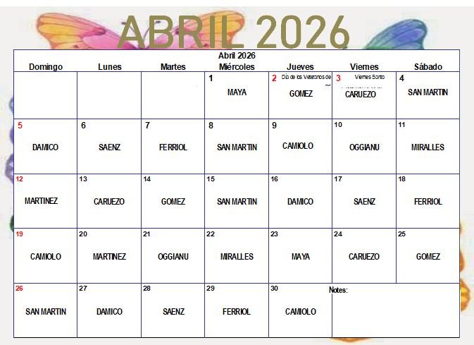*Los turnos comienzan a las 8.30am del día indicado finalizando a las 8.30am del día siguiente.